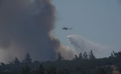 İzmir'in Foça ilçesinde çıkan orman yangınına havadan ve karadan müdahale ediliyor.