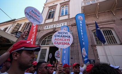 İzmir Büyükşehir Belediyesinden işten çıkarılan işçiler, Türkiye Belediyeler ve Genel Hizmetler İşçileri Sendikası (Belediye-İş) öncülüğünde protesto eylemlerine devam ediyor. Eylemler, Egemenlik Binası önünde 200 kişilik bir grup tarafından gerçekleştirildi.