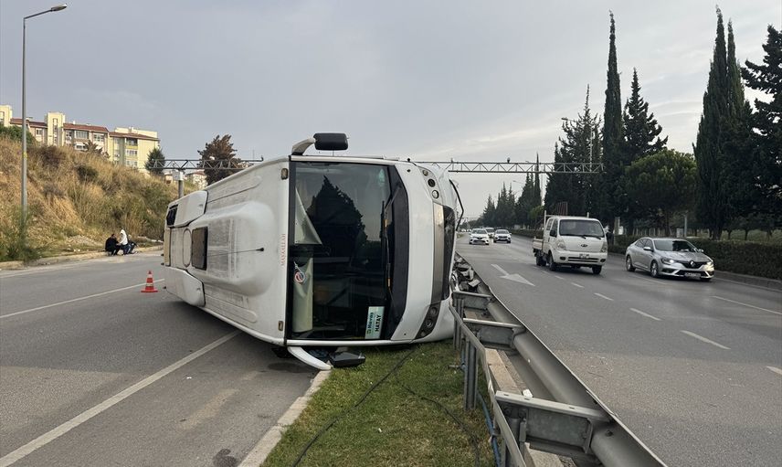İzmir'in Gaziemir ilçesinde, H.B. (57) yönetimindeki ve İzmir Adnan Menderes Havalimanı personelini taşıyan, plakası henüz öğrenilemeyen midibüs, Menderes Caddesi'nde refüje çarpıp devrildi.