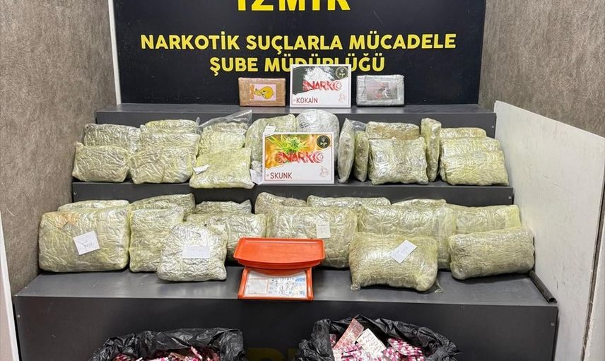 İzmir'in Konak ilçesinde düzenlenen operasyonda, 28 kilo 240 gram esrar ve skunk, 2 kilo 166 gram kokain ile 29 bin 350 sentetik ecza ele geçirildi. Toplam yakalanan miktar 30 kilo 406 gram olarak kaydedildi.