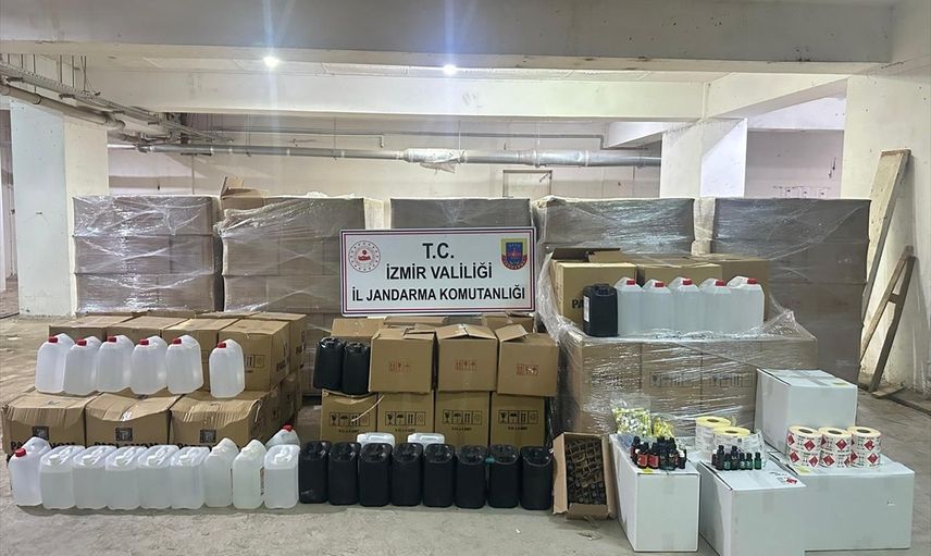 Konak ilçesinde faaliyet gösteren bir ecza deposunda yapılan aramalarda 7 ton etil alkol, 62 bin 300 sahte etil alkol etiketi ve 242 aroma ele geçirildi.