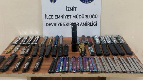 İzmit’te polis, Doğu Kışla pazarında durdurduğu iki çocuğun üzerinden 52 kesici alet ve şok cihazı buldu.