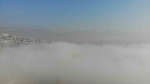 Kahramanmaraş'ta sabah etkili olan sis, Dulkadiroğlu ve Onikişubat'ta yoğunlaşıp görüşü 30 metreye kadar düşürdü; yüksek kesimlerde güneş açtı. Sis dronla görüntülendi.