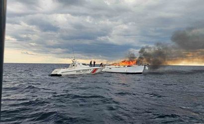 ANTALYA'NIN KAŞ İLÇESİ KALKAN AÇIKLARINDA SEYİR HÂLİNDEYKEN YANMAYA BAŞLAYAN VE SAHİL GÜVENLİK EKİPLERİNİN HIZLI MÜDAHALESİYLE KAPTANININ KURTARILDIĞI TEKNENİN YANMA ANLARI DRONLA GÖRÜNTÜLENDİ.