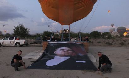 Nevşehir'in Göreme beldesindeki balon kalkış alanında görevli ekipler sepetlere Türk bayraklarını astı. Turistler turlara bindikten sonra balonlar peş peşe gökyüzüne yükseldi.