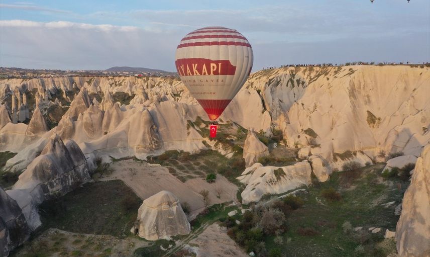 Nevşehir'in Göreme beldesinde, uçuş için hazırlanan sıcak hava balonlarına görevlilerce asılan Türk bayrakları, bayram coşkusunu iki kat artırdı. Turistlerin sabah saatlerinde sepetlere alınmasının ardından balonlar peş peşe gökyüzüne yükseldi ve muhteşem bir manzara oluşturdu.