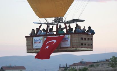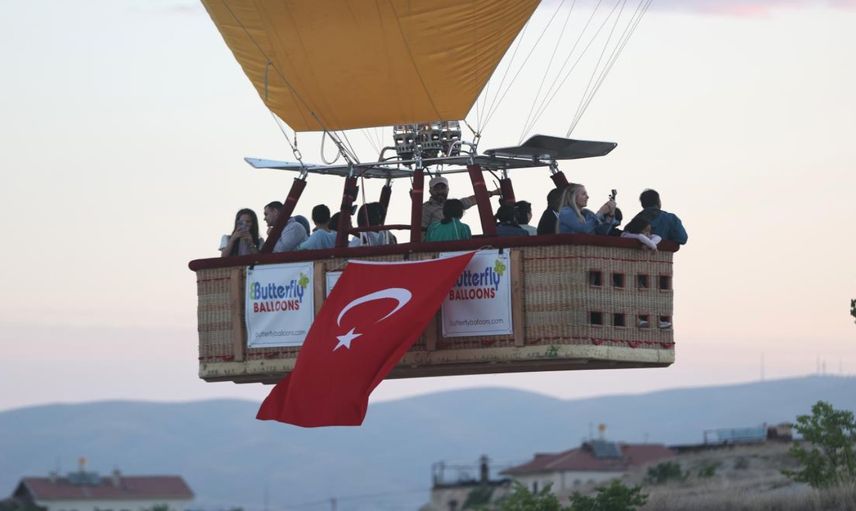 Göreme beldesi ve Çavuşin köyü çevresindeki kalkış alanında, hazırlanan balonların sepetlerine görevliler tarafından Türk bayrakları ve çeşitli posterler asıldı. Bu özel etkinlik, bölgeye renk katarken, katılımcıların da büyük ilgisini çekti.