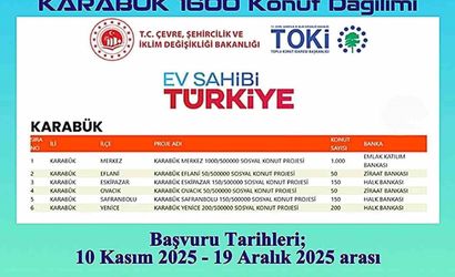 KARABÜK’TE ÇEVRE, ŞEHİRCİLİK VE İKLİM DEĞİŞİKLİĞİ BAKANLIĞI İLE TOKİ TARAFINDAN YÜRÜTÜLEN "EV SAHİBİ TÜRKİYE" PROJESİ KAPSAMINDA 1600 SOSYAL KONUT İÇİN BAŞVURULAR 10 KASIM-19 ARALIK 2025 TARİHLERİ ARASINDA ALINACAK.