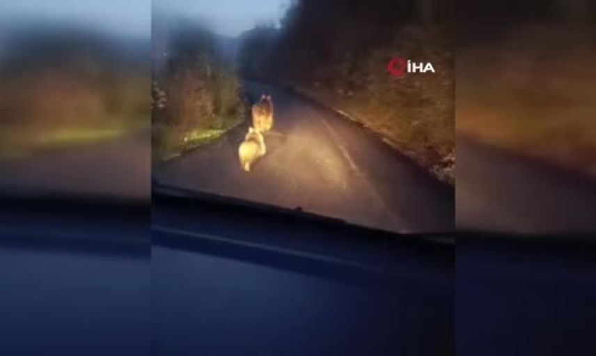 KARABÜK’ÜN YENİCE İLÇESİNDE ANNE AYI VE İKİ YAVRUSU YOLDA KOŞARKEN CEP TELEFONU KAMERASIYLA GÖRÜNTÜLENDİ.