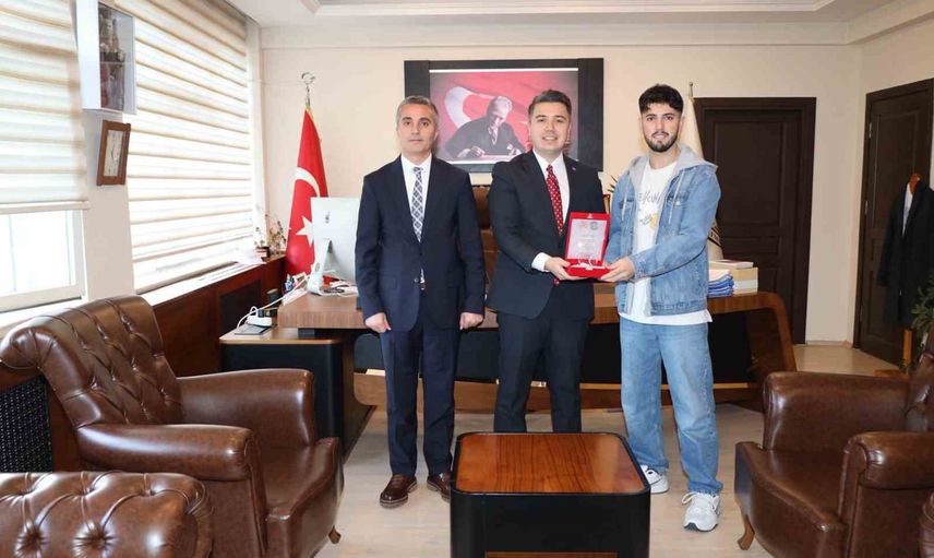 AYDIN'IN KARACASU İLÇESİNDE KAPALI SPOR SALONU'NA YAPTIĞI ÇİZİMLERLE BEĞENİ TOPLAYAN KARACASU MEMNUNE İNCİ MESLEK YÜKSEKOKULU ÖĞRENCİSİ ARAFAT ERCAN, KAYMAKAM MEHMET GÜNDOĞDU TARAFINDAN PLAKET İLE ONURLANDIRILDI.