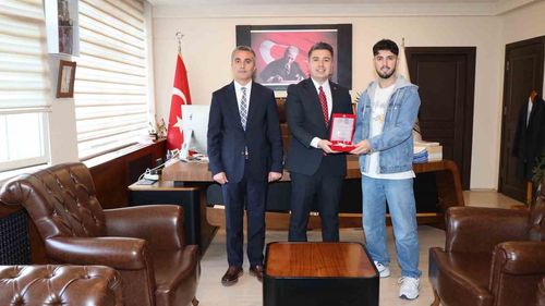 Karacasu Memnune İnci Meslek Yüksekokulu öğrencisi Arafat Ercan, Kapalı Spor Salonu'ndaki çizimleri nedeniyle Kaymakam Mehmet Gündoğdu tarafından plaketle ödüllendirildi.