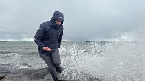 Karadeniz'de etkili olan şiddetli rüzgar, dev dalgaların oluşmasına neden oldu. Canik ilçesindeki sahil yolunda temizlik çalışmaları başladı.
