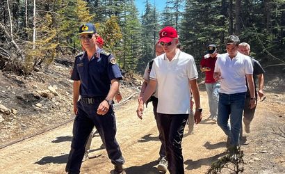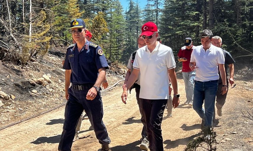 Karaman Valisi Mehmet Fatih Çiçekli (ortada) ve İl Jandarma Komutanı Kıdemli Albay Osman Saygılı (solda), Ermenek ve Sarıveliler ilçelerinde çıkan orman yangınlarının söndürülmesinin ardından incelemelerde bulundu.