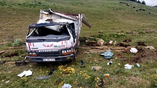 Kars'ın Sarıkamış ilçesinde devrilen kamyonette 2 kişi yaralandı; 17 küçükbaş hayvan telef oldu.