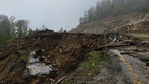 Kastamonu-Çatalzeytin kara yolunda heyelan sonrası çalışmalar sürüyor. Ulaşım alternatif yoldan sağlanıyor.