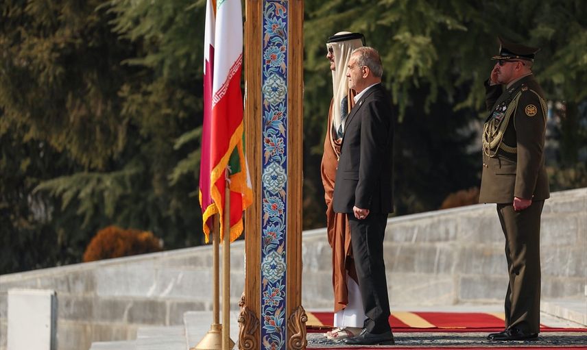 Katar Emiri Şeyh Temim bin Hamed Al Sani (solda), resmi temaslarda bulunmak üzere geldiği İran'ın başkenti Tahran'da, İran Cumhurbaşkanı Mesud Pezeşkiyan (sağda) tarafından Sadabat Sarayı'nda resmi törenle karşılandı.