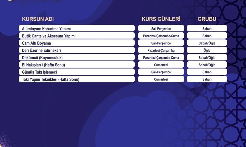 Kurslar, alanında uzman eğitmenler tarafından tamamen ücretsiz verilecek olup, kontenjanları sınırlı. Başvurular www.kaymekonline.com adresi üzerinden yapılabilecek. Ayrıntılı bilgi için vatandaşlar 0 352 231 80 31 numaralı telefondan ulaşabilir.