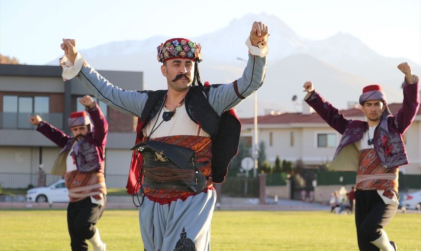 Kayseri'de halk oyunları ekibinden iki kişi, 29 Ekim Cumhuriyet Bayramı dolayısıyla efe kıyafeti giyerek, Ali Dağı'ndan yamaç paraşütüyle atlayış yaptı.