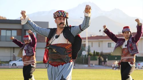 Kayseri'de 29 Ekim'de Efe Kıyafetiyle Yamaç Paraşütü Ali Dağı'ndan iniş, gökyüzünde Türk bayrağı ve alanda zeybek Kayseri'de halk oyunları ekibinden iki kişi, 29 Ekim Cumhuriyet Bayramı dolayısıyla efe kıyafeti giyerek, Ali Dağı'ndan yamaç paraşütüyle atlayış yaptı. Gençlik ve Spor İl…