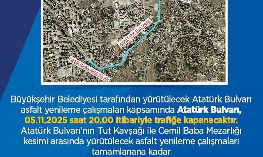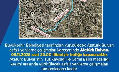 Belediyeden yapılan açıklamanın tam metni şöyle: "Büyükşehir Belediyesi tarafından yürütülecek Atatürk Bulvarı asfalt yenileme çalışmaları kapsamında Atatürk Bulvarı, 05.11.2025 saat 20.00 itibariyle trafiğe kapanacaktır. Atatürk Bulvarı’nın Tut Kavşağı ile Cemil Baba Mezarlığı kesimi arasında yürütülecek asfalt yenileme çalışmaları tamamlanana kadar sürücülerimizin belirtilen tarih ve saatten itibaren trafik işaret ve işaretçilerini dikkate alarak alternatif güzergâhları kullanmaları ve vatandaşlarımızın otobüs seferleri için belirlenen alternatif otobüs güzergâhlarını dikkate almaları önemle rica olunur"