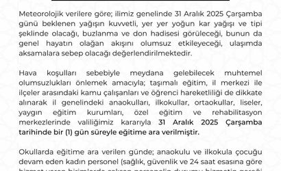 Açıklamada, "Hava koşulları sebebiyle meydana gelebilecek muhtemel olumsuzlukları önlemek amacıyla, taşımalı eğitim, il merkezi ile ilçeler arasındaki kamu çalışanları ve öğrenci hareketliliği de dikkate alınarak, il genelindeki anaokulları, ilkokullar, ortaokullar, liseler, yaygın eğitim kurumları, özel eğitim ve rehabilitasyon merkezlerinde valiliğimiz kararıyla 31 Aralık 2025 Çarşamba tarihinde bir gün süreyle eğitime ara verilmiştir" denildi.