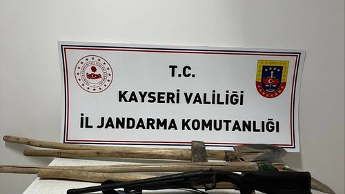 Kayseri'de jandarma, izinsiz kazı yapan iki şüpheliyi suçüstü yakaladı ve ruhsatsız silah ele geçirildi.