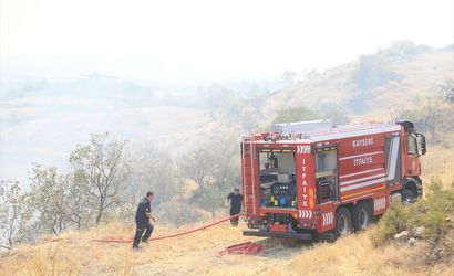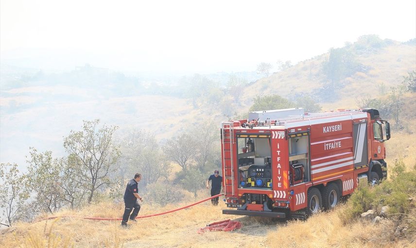 Kayseri'nin merkez Melikgazi ilçesinde Hasan Dağı eteklerinde bulunan otluk alanda çıkan yangına, olay yerine sevk edilen itfaiye, Orman Bölge Müdürlüğü, KASKİ ve polis ekipleri tarafından müdahale ediliyor.