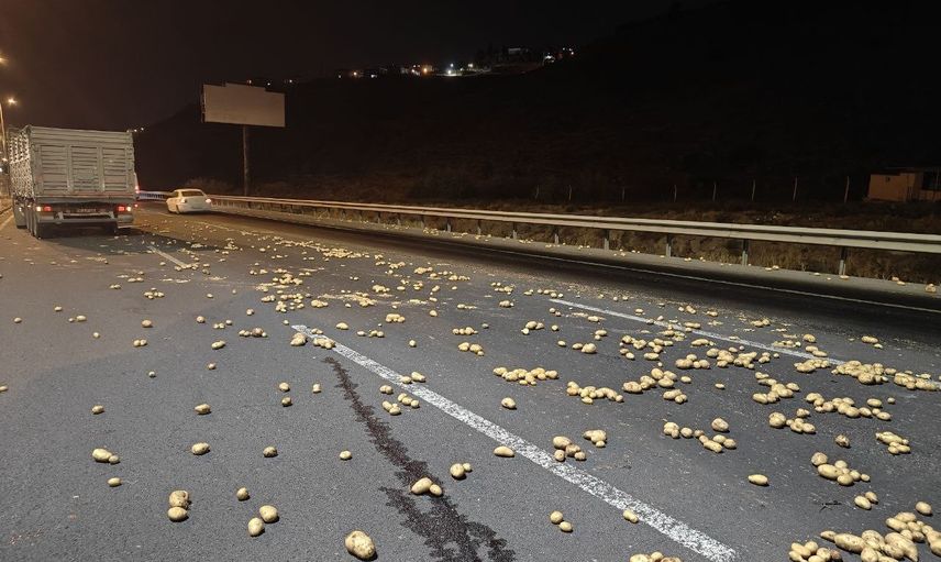 Tırın makaslaması sonucu araç yol ortasında kalırken, üzerinde yüklü bulunan onlarca kilo patates yola saçıldı. Olayda yaralanan olmadı.