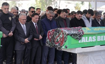 Kayseri'de eski eşi tarafından pompalı tüfekle öldürülen 3 çocuk annesi üniversite öğrencisi kadının cenazesi toprağa verildi. Cenaze törenine, Keskin'in babası İsmail Keskin (sol 4), Kayseri Valisi Gökmen Çiçek (sol 3), Büyükşehir Belediye Başkanı Memduh Büyükkılıç (sol 2) ve İl Emniyet Müdürü Atanur Aydın (solda) da katıldı.