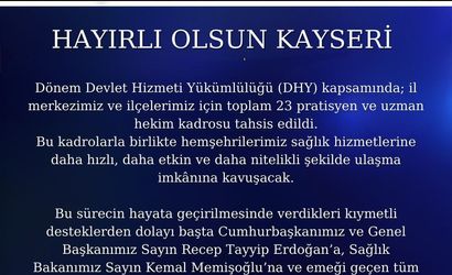 "Dönem Devlet Hizmeti Yükümlülüğü (DHY) kapsamında; il merkezimiz ve ilçelerimiz için toplam 23 pratisyen ve uzman hekim kadrosu tahsis edildi. Bu kadrolarla birlikte hemşehrilerimiz sağlık hizmetlerine daha hızlı, daha etkin ve daha nitelikli şekilde ulaşma imkânına kavuşacak. Bu sürecin hayata geçirilmesinde verdikleri kıymetli desteklerden dolayı başta Cumhurbaşkanımız ve Genel Başkanımız Recep Tayyip Erdoğan’a, Sağlık Bakanımız Kemal Memişoğlu’na ve emeği geçen tüm yetkililere teşekkür ediyorum. Yeni hekim kadrolarının Kayseri’mize ve aziz hemşehrilerimize hayırlı olmasını diliyorum".