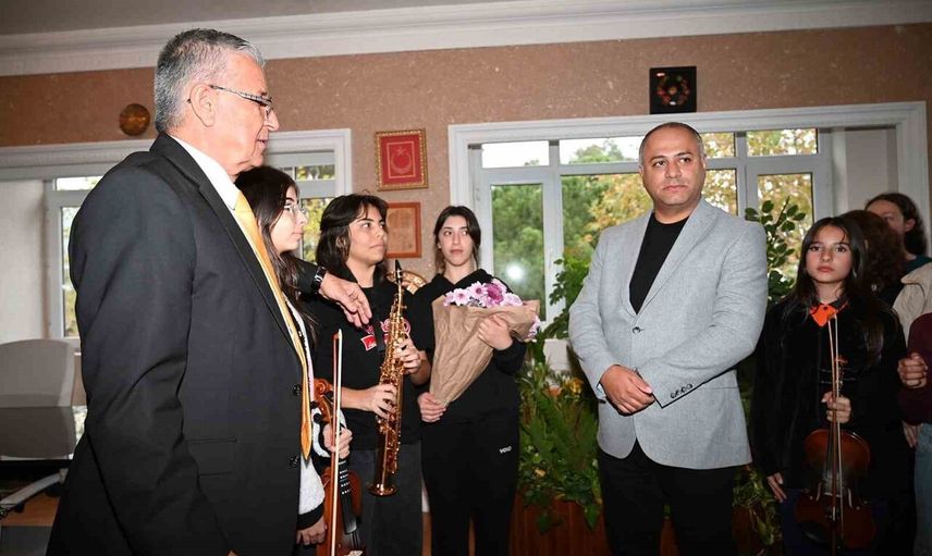 Ziyaret sonrası öğrenciler Başkan Topaloğlu’na çiçek vererek Öğretmenler Gününü kutladı. Öte yandan Başkan Topaloğlu, orkestra üyelerine bir otelde yemek sözü verdi.
