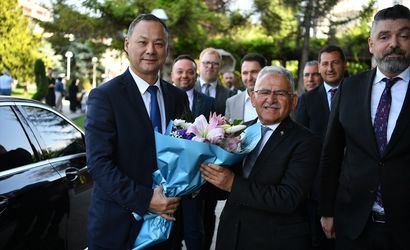 Kırgızistan'ın Ankara Büyükelçisi Ruslan Kazakbayev (solda), Kayseri Büyükşehir Belediye Başkanı Memduh Büyükkılıç'ı (sağ 2) ziyaret etti.