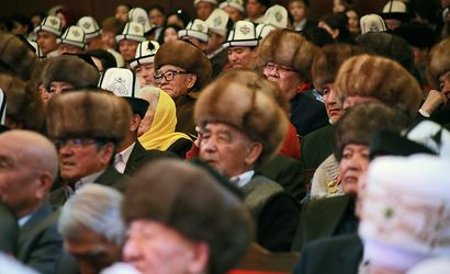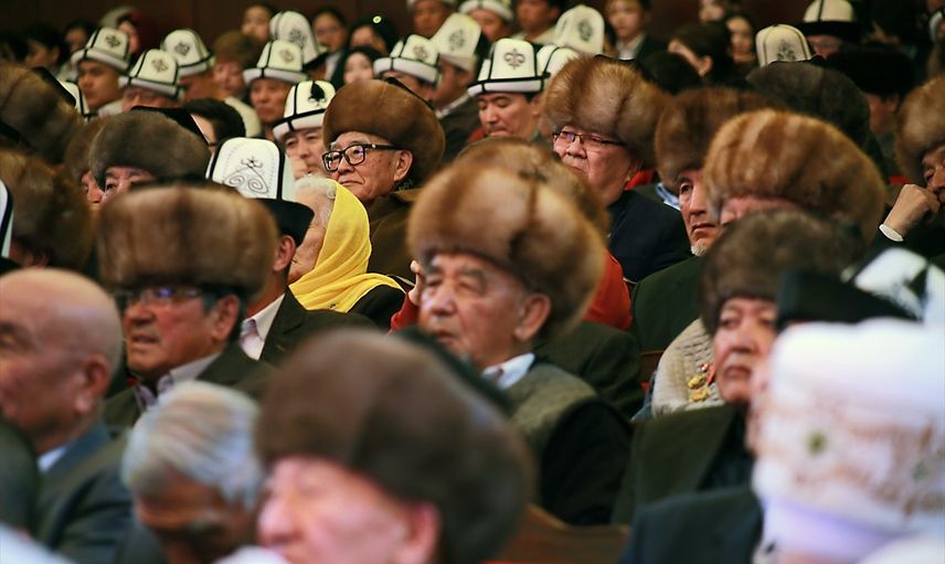 Başkent Bişkek'teki Büyük Konser Salonu'nda düzenlenen etkinliğin başlangıcında, ülkenin dört bir yanından davet edilen aksakallar, Kırgız Havacılık Enstitüsü öğrencilerinin oluşturduğu koridordan alkışlar eşliğinde geçirildi.