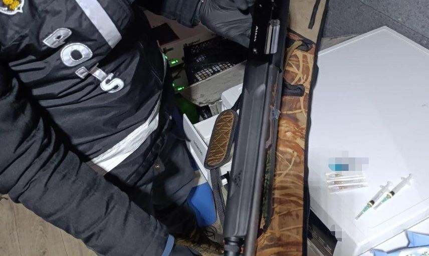 3 adet ruhsatsız tabanca, 1 adet ruhsatsız yivsiz tüfek, 104 adet dolu fişek, çelik tank içerisinde 16 litre şarap, toplam değeri 8 milyon TL olan 7 adet senet, 5 adet tapu, 8 adet cep telefonu ve 1 adet laptop.