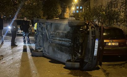 Kırklareli'nde park halindeki iki otomobile çarparak devrilen hafif ticari aracın sürücüsü, aracını bırakarak kaçtı.