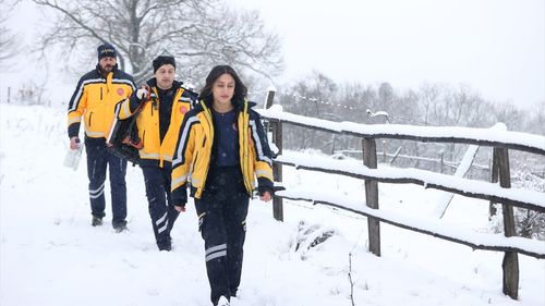 Kırklareli Yıldız Dağları'nda yoğun kar yağışıyla mücadele eden sağlık ekipleri, paletli ambulanslarla hastalara ulaşmak için çabalıyor.