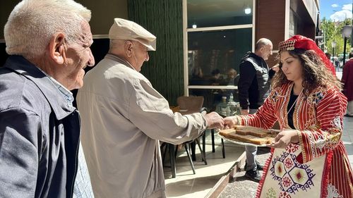 Kırşehir'de Ahi kaftanı giyen heyet, davul zurna eşliğinde esnafı 22-28 Eylül'deki 38. Ahilik Haftası'na davet etti; esnafa Ahi helvası ve Türk bayrağı verildi.