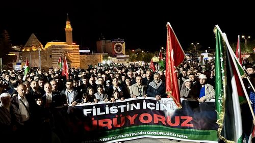 Kırşehir'de düzenlenen yürüyüşte vatandaşlar ve STK'lar, İsrail'in Küresel Sumud Filosu'na saldırılarını protesto ederek Gazze ve Filistin'e destek mesajları verdi.