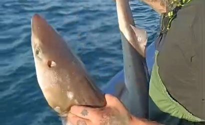 YASİN PÜSKÜLLÜ, AĞA TAKILAN KÖPEKBALIĞINI DENİZE BIRAKTI