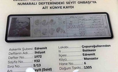 SEYİT ONBAŞI'NIN ASKERLİK KÜNYE KAYDI VE GENÇLİK FOTOĞRAFLI ÖZEL OLARAK ÇERÇEVELENEREK BALIKESİR VALİSİ İSMAİL USTAOĞLU'NA HAVRAN'DA BULUNAN SEYİT ONBAŞI MÜZESİNDE SERGİLENMEK ÜZERE TESLİM EDİLDİ