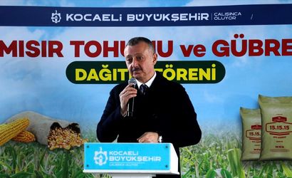 Kocaeli Büyükşehir Belediyesince 1500 çiftçiye yüzde 50 hibeli 70 ton mısır tohumu, 3 bin üreticiye de 1150 ton gübre dağıtılacak. Büyükşehir Belediye Başkanı Tahir Büyükakın, İzmit Akmeşe Tarım Kredi Kooperatifi'nde düzenlenen törende konuşma yaptı.