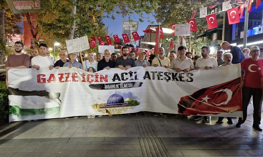 Etkinlikte, Türk ve Filistin bayraklarıyla Fevziye Camisi önünde toplanan kalabalık, "Nehirden denize özgür Filistin" ve "Katil İsrail" sloganları atarak Anıtpark'a kadar yürüdü.