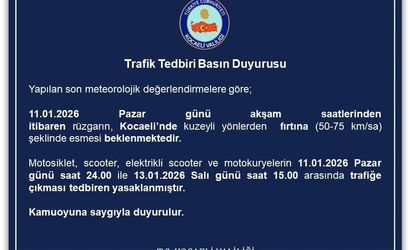 Yapılan son meteorolojik değerlendirmelere göre; 11.01.2026 Pazar günü akşam saatlerinden itibaren rüzgarın, Kocaeli’nde kuzeyli yönlerden fırtına (50-75 km/sa) şeklinde esmesi beklenmektedir.