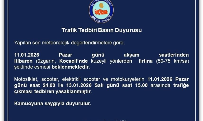Motosiklet, scooter, elektrikli scooter ve motokuryelerin 11.01.2026 Pazar günü saat 24.00 ile 13.01.2026 Salı günü saat 15.00 arasında trafiğe çıkması tedbiren yasaklanmıştır.