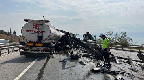 Kocaeli'de Tanker D-100'de Yön Levhasına Çarptı, Ulaşım Aksadı