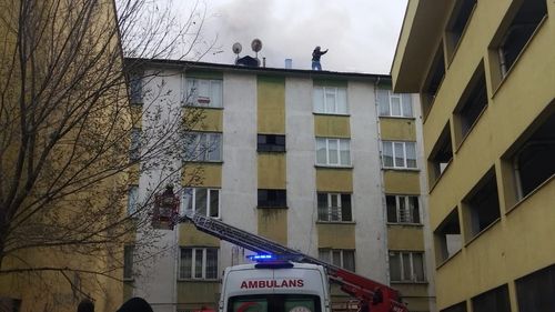 Konya'nın Karatay ilçesinde 5 katlı bir binanın çatısında çıkan yangına itfaiye ekipleri müdahale ediyor.
