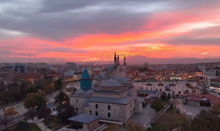 Farklı zaman dilimlerinde dron ile kaydedilen görüntülerde Mevlana Müzesi ve Sultan Selim Camii önünden güneşin batışı, gökyüzünde beliren kızıl tonlar ve bulutların yarattığı dramatik atmosfer dikkat çekti.