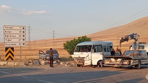 Konya'nın Yunak ilçesinde meydana gelen kazada 16 kişi yaralandı. Minibüs ile otomobilin çarpışması sonrası her iki araç devrildi.