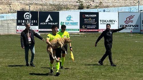 Konya'daki amatör maça giren köpek, hakem tarafından kırmızı kart gösterilerek sahadan çıkarıldı.