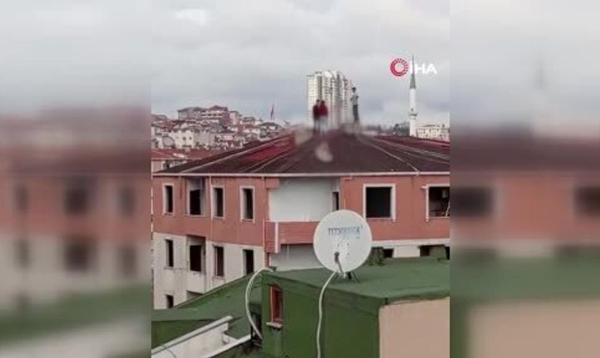 Küçükçekmece'de çatıda fotoğraf çeken çocukların tehlikeli oyunu kamerada